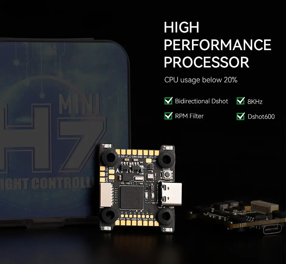 T-HOBBY H7 Mini — это мощный и компактный полетный контроллер, разработанный для широкого спектра FPV-систем. Благодаря монтажному размеру 20x20 мм, встроенному барометру DPS310 и раздельному питанию гироскопа для защиты от помех, он является отличным выбором для 5" гоночных и фристайл дронов, а также 3.5" синевупов.